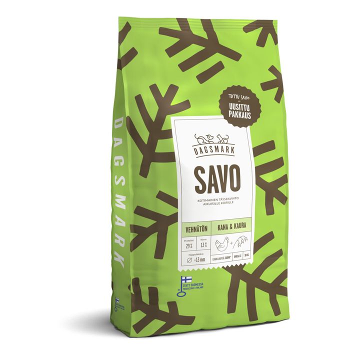 SAVO-koiranruoka yhdistää hyvin sulavat, luonnolliset raaka-aineet, kuten kotimaisen kanan, kauran, perunan ja pellavan, sekä kaikki koiran tarvitsemat vitamiinit ja kivennäisaineet. Resepti on täysin vehnätön ja soijaton, eikä se sisällä säilöntä-, aromi- tai väriaineita. Dagsmark-koiranruoat valmistetaan Loimaalla suomalaisista raaka-aineista, ja tuotteilla on Avainlippu-merkki, joka takaa kotimaisen laadun.