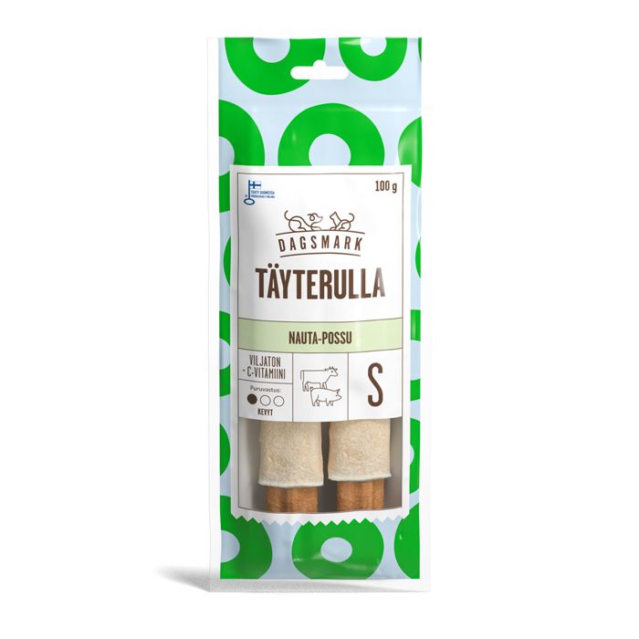 ‌Kotimainen Dagsmark Täyterulla nauta-possu on puruluu, jossa on päällä ohut naudannahka ja sisällä possutäyte. Possutäyte on Mellilä nameista tuttua possu-mustikkanamia, joka sisältää kollageenia ja C-vitamiinia, jotka puolestaan tukevat koiran ihon ja nivelten luonnollista hyvinvointia. Tämä herkku soveltuu myös heikommalle puruvoimalle.