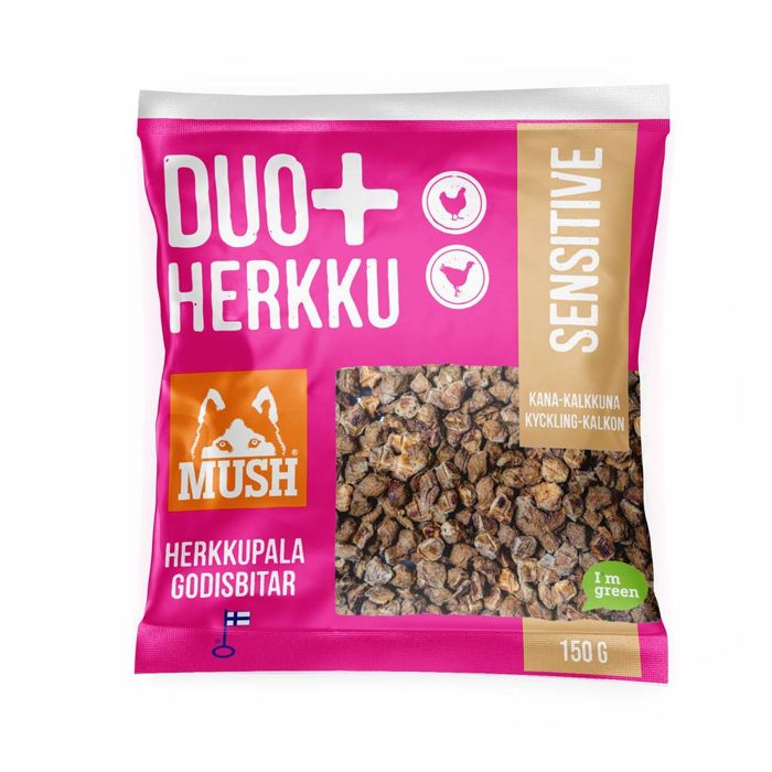 ‌‌DUO+ Herkku SENSITIVE Kana-Kalkkuna on viljaton, vitaminoitu ja helposti sulava makupala, joka sopii kaikenkokoisille koirille.