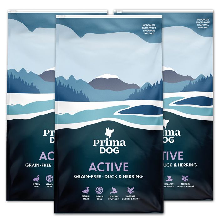 PrimaDog Active Ankka & Silli on täysin viljaton ja erittäin korkealaatuinen täysravinto normaalia aktiivisemmille koirille.