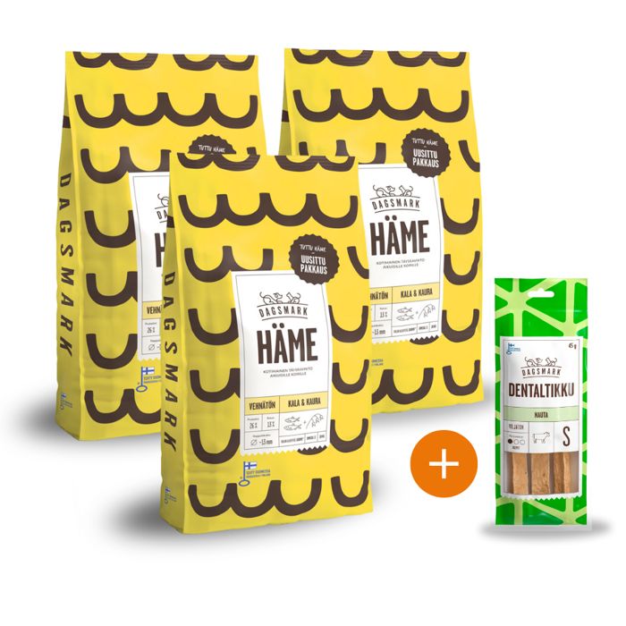 Olet arvostelemassa: 3 x 10 kg Dagsmark HÄME + kaupanpäälle Dagsmark DENTALTIKKU, nauta S 45 g
