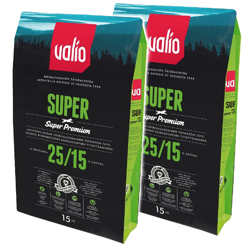 Osta kaksi säkkiä kerralla edullisempaan yhteishintaan! Valio Super on normaaliaktiivisille ja normaalipainoisille koirille suunniteltu täysravinto. Se soveltuu kaikenkokoisille ja -rotuisille aikuisille koirille. Tasapainoinen proteiinien, rasvojen ja hiilihydraattien pitoisuus vastaa koiran päivittäiseen energiantarpeeseen ja tukee nopeaa palautumista rasituksen jälkeen.