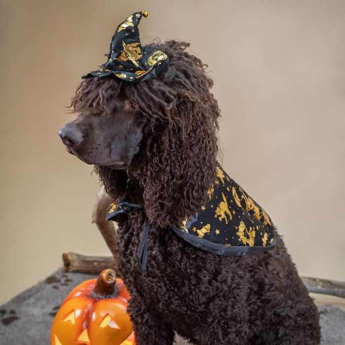 Pakkaus sisältää tyylikkään viitan sekä siihen sointuvan tötteröhatun. Hatussa on pieni kulkunen. Soveltuu parhaiten pienelle koiralle tai isolle kissalle.