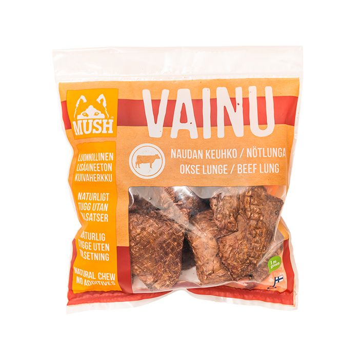 Suomessa valmistettu herkullinen ja rapea välipala lihansyöjille. MUSH VAINU -kuivaherkut ovat maistuvia ja terveellisiä välipaloja, joka soveltuvat kaikkiin lemmikin elämänvaiheisiin. Erittäin kevyttä ja maistuvaa naudankeuhkoa on helppo kantaa mukana myös pidemmille matkoille. Miellyttävän huokoiset palat saa pienittyä helposti pienemmäksi ja ne soveltuvat erinomaisesti kaikenikäisille lemmikeille. Keuhkopaloja kannattaa tarjota myös kissoille!