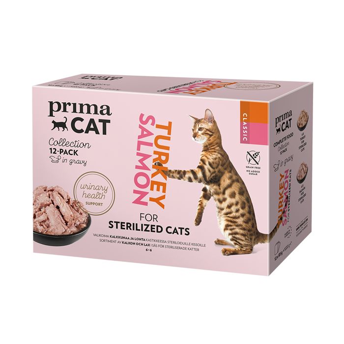 Olet arvostelemassa: PrimaCat Classic Kastikelajitelma -kissanruoka steriloiduille kissoille, Kalkkuna / Lohi, 12 x 85g