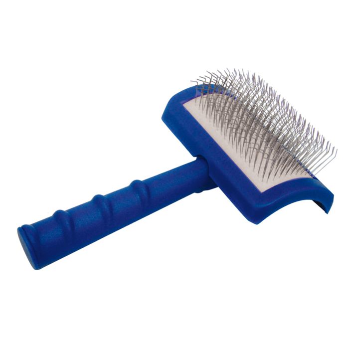 Pitkä, kädelle mukava kahva ja täydellisesti kaareva harjaspää helpottavat hankalien alueiden käsittelyä. Pehmeä tyyny ja erityiseen kulmaan asetetut joustavat piikit takaavat syvällisen mutta hellävaraisen harjauksen paksuille turkeille.